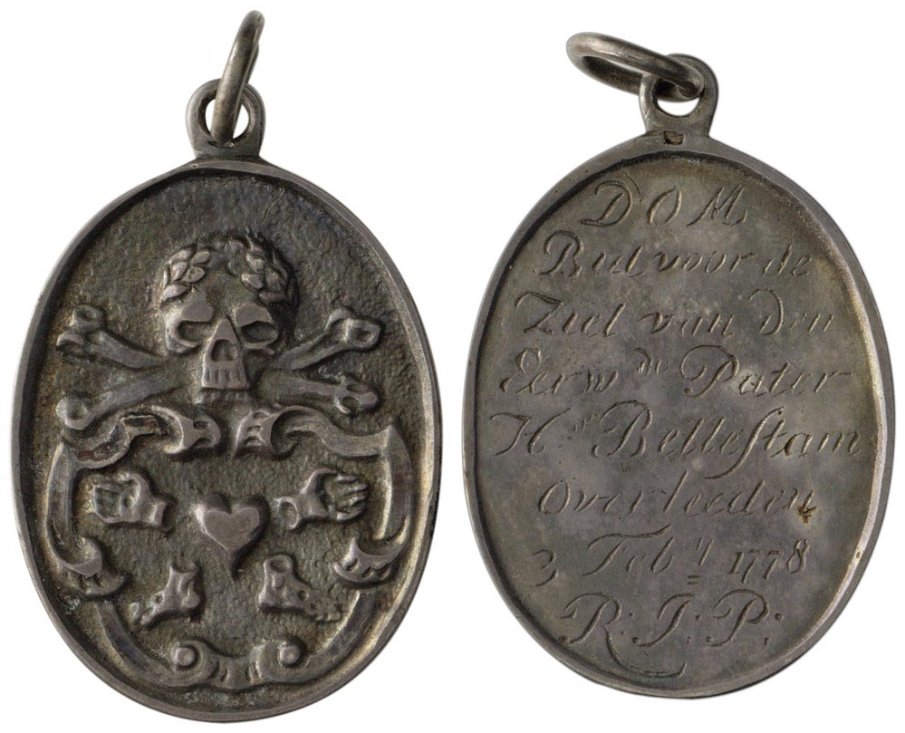 voorzijde: een doodskop mat lauwerkrans boven twee gekruiste beenderen; daaronder een schild waarop een hart, twee handen en twee voeten. bovenaan een oogje met een ring.