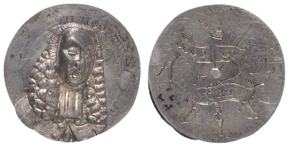voorzijde: het gedreven borstbeeld, rechts gewend, met omschrift. Los reliëf op onderplaat.