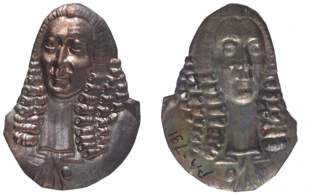 voorzijde: het gedreven naar links gewende borstbeeld van H.D. Hooft, met pruik, bef en mantel. Uitgesneden coutour. keerzijde: onbewerkt.- Trefwoorden