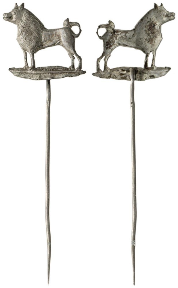voorzijde: ajour bewerkte keeshond naar links op een voetstuk op een lange speld. keerzijde: onbewerkt.- HerkomstSchenking G.A. Heineken, Amsterdam, 1885.