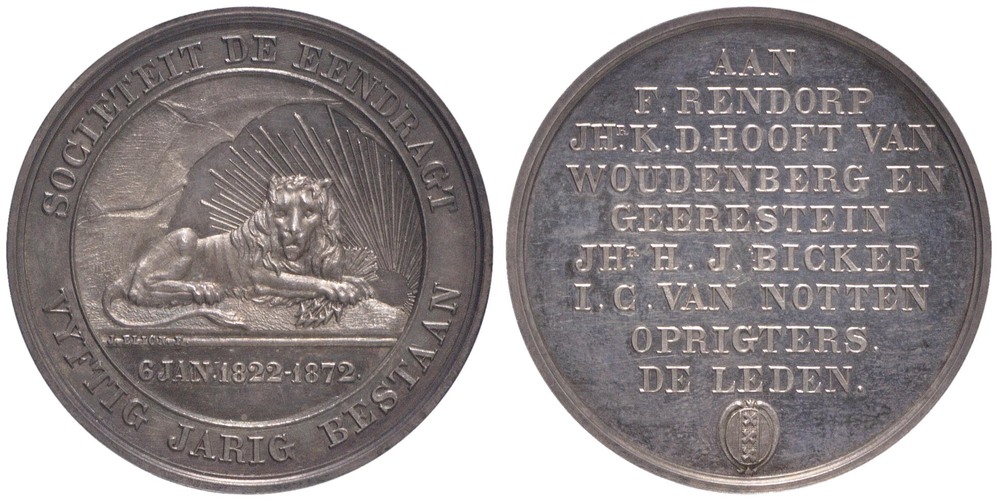 opschrift keerzijde: AAN / F. RENDORP / JHr K.D.HOOFT VAN / WOUDENBERG EN / GEERESTEIN / JHr H.J.BICKER / I.C. VAN NOTTEN / OPRICHTERS. / DE LEDEN.