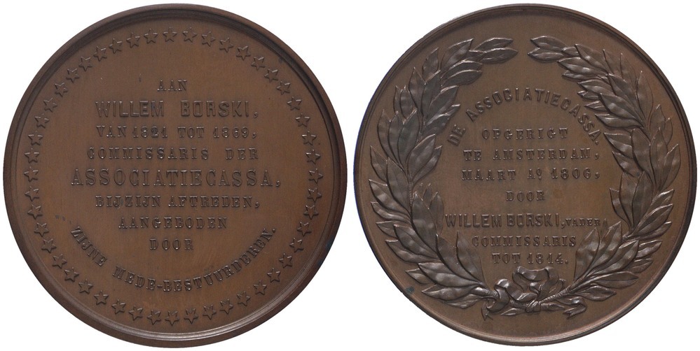 opschrift voorzijde: AAN / WILLEM BORSKI / VAN 1821 TOT 1869, / COMMISSARIS DER / ASSOCIATIE CASSA, / BIJ ZIJN AFTREDEN, / AANGEBODEN / DOOR / ZIJNE MEDE-BESTUURDEREN.