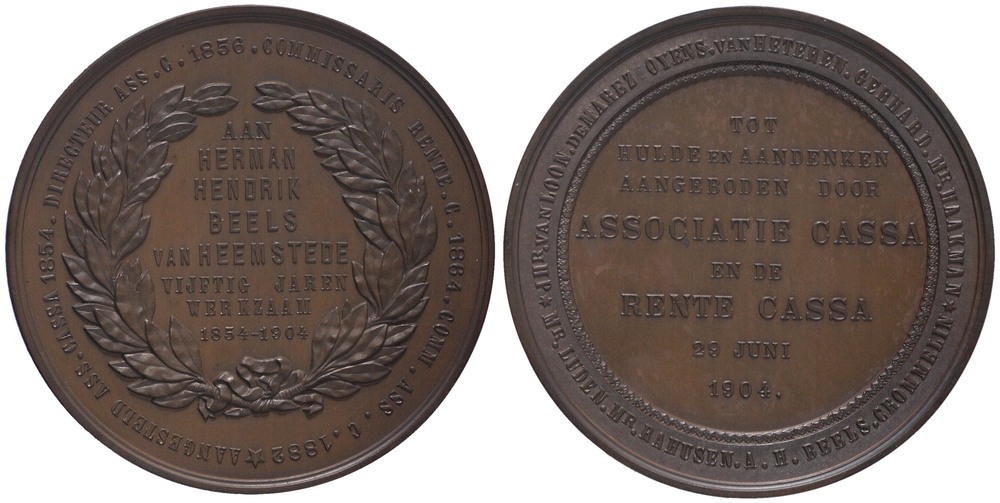 opschrift keerzijde: TOT / HULDE EN AANDENKEN / AANGEBODEN DOOR / ASSOCIATIE CASSA / EN DE / RENTE CASSA / 29 JUNI / 1904.