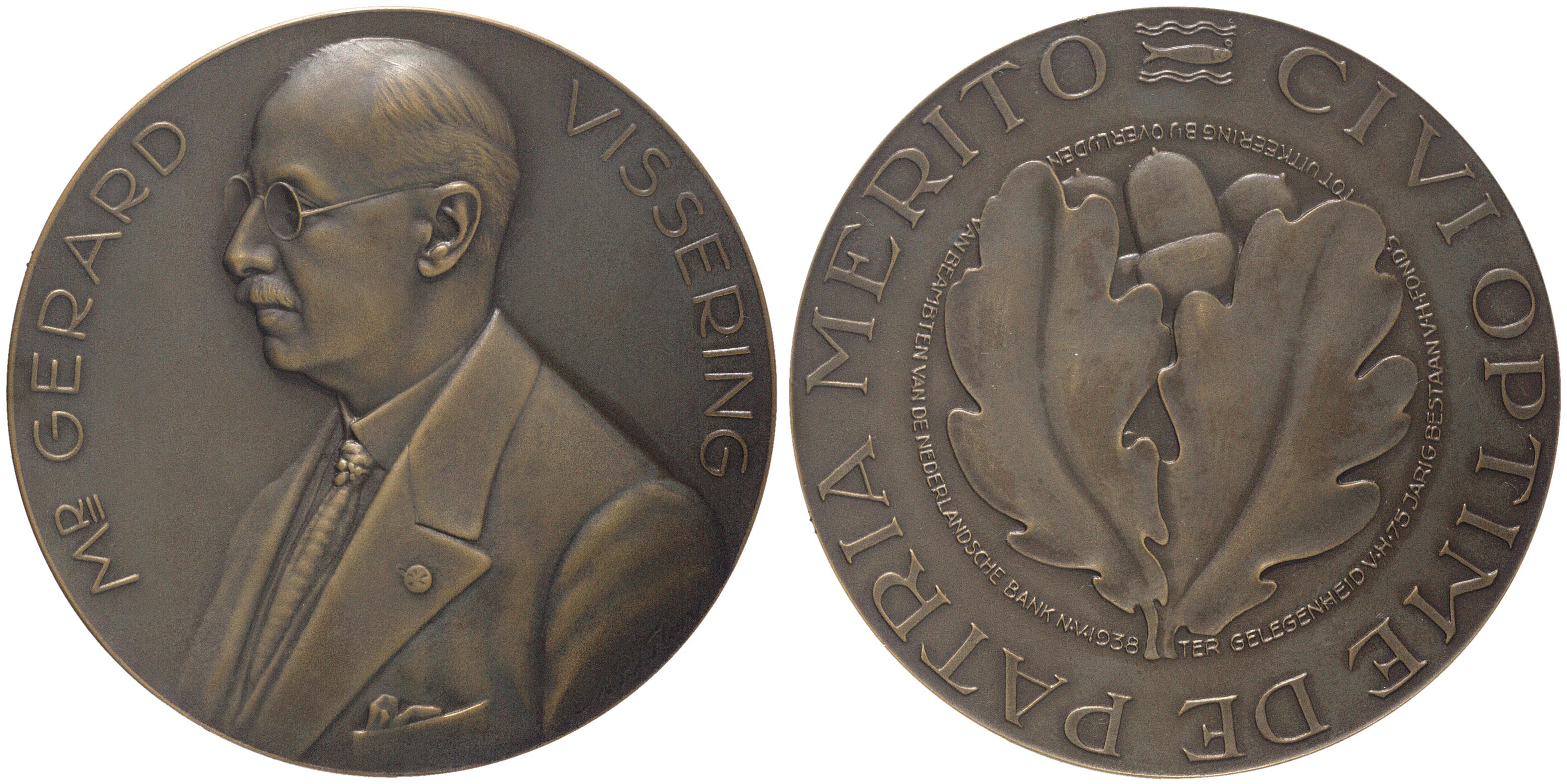 omschrift keerzijde: TER GELEGENHEID V.H. 75-JARIG BESTAAN V.H. FONDS TOT UITKEERING BIJ OVERLIJDEN VAN BEAMBTEN VAN DE NEDERLANDSCHE BANK N.V.I. 1938