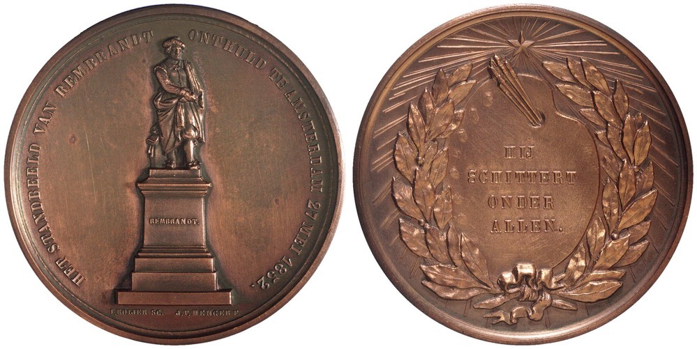 omschrift voorzijde: HET STANDBEELD VAN REMBRANDT ONTHULD TE AMSTERDAM 27 MEI 1852.