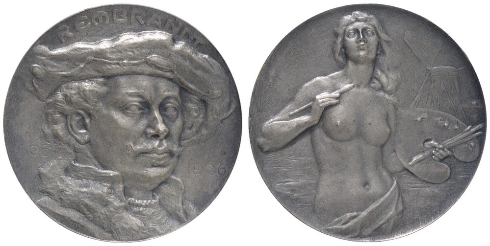 voorzijde: naar rechts gewend borstbeeld van Rembrandt met baret tussen de jaartallen 1606 en 1906. Boven de baret een opschrift. Linksonder de letters R.m.
