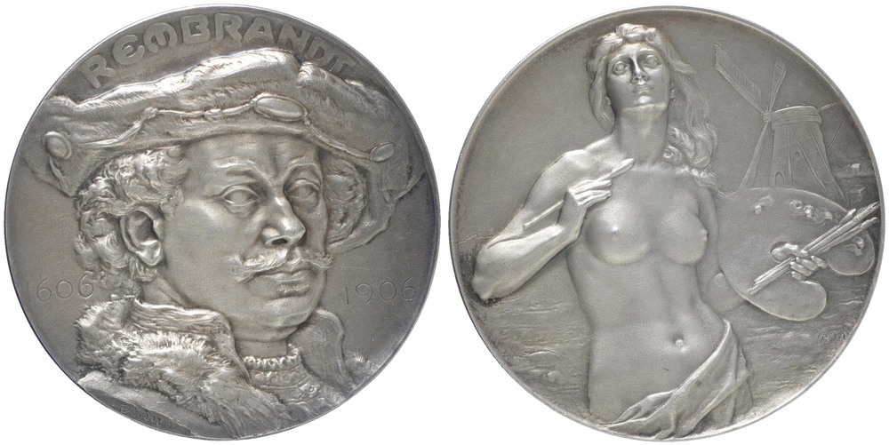 voorzijde: naar rechts gewend borstbeeld van Rembrandt met baret tussen de jaartallen 1606 en 1906. Boven de baret een opschrift. Linksonder de letters R.m.