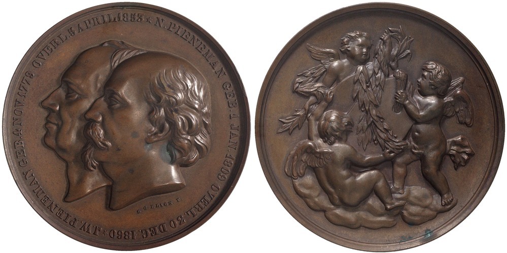 Voorzijde: twee naar links gewende borstbeelden van de kunstenaars Jan Willem Pieneman (1779-1853) en zijn zoon Nicolaas Pieneman (1809-1860) met omschrift.