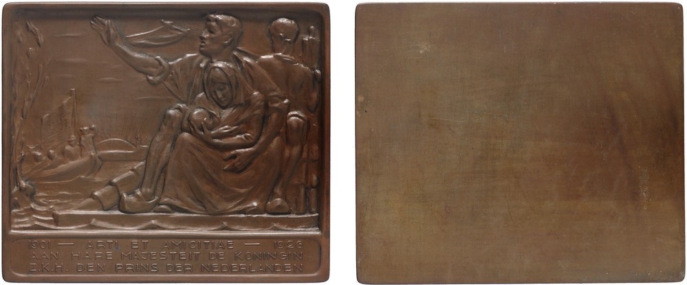 Plaquette op de watersnood, ter gelegenheid van het 25-jarig bestaan van Arti et Amicitiae, aangeboden aan Koningin Wilhelmina en Prins Hendrik bij het zilveren huwelijk, 1926