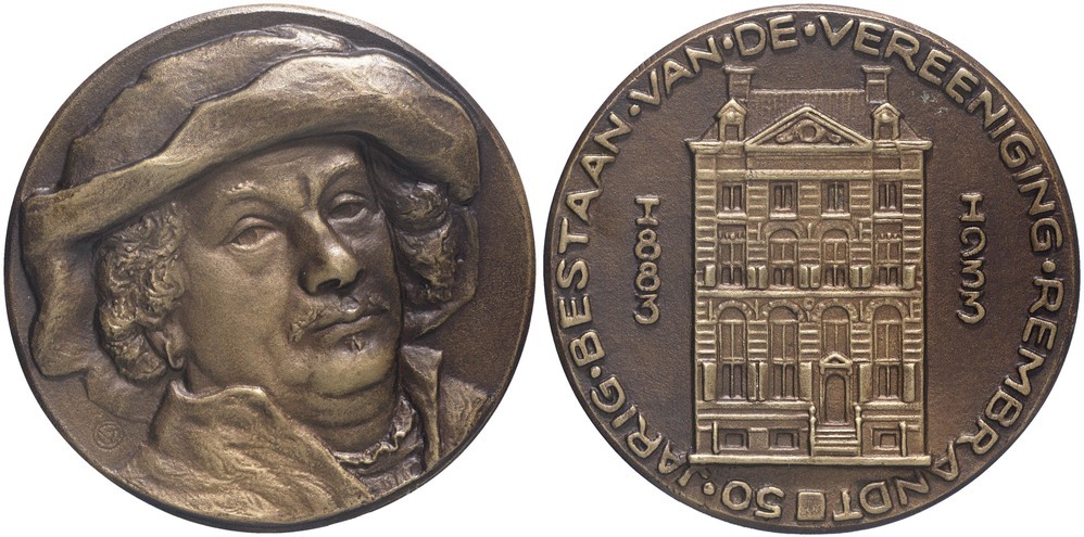 voorzijde: het iets naar rechts gewende borstbeeld van Rembrandt met slappe hoed (naar een zelfportret van Frau von Mendelssohn te Berlijn). Linksonder een monogram.