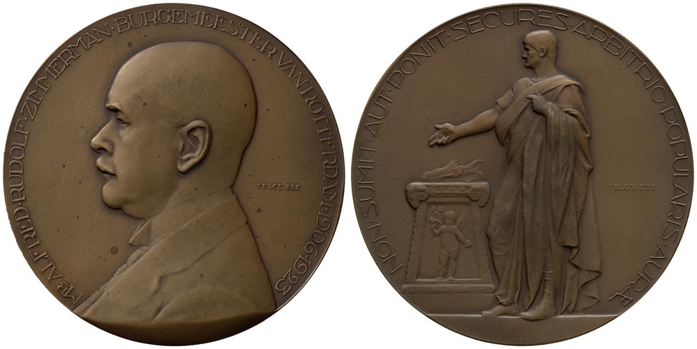 omschrift voorzijde: MR . ALFRED . RUDOLF . ZIMMERMAN . BURGEMEESTER . VAN . ROTTERDAM . 1906 - 1923