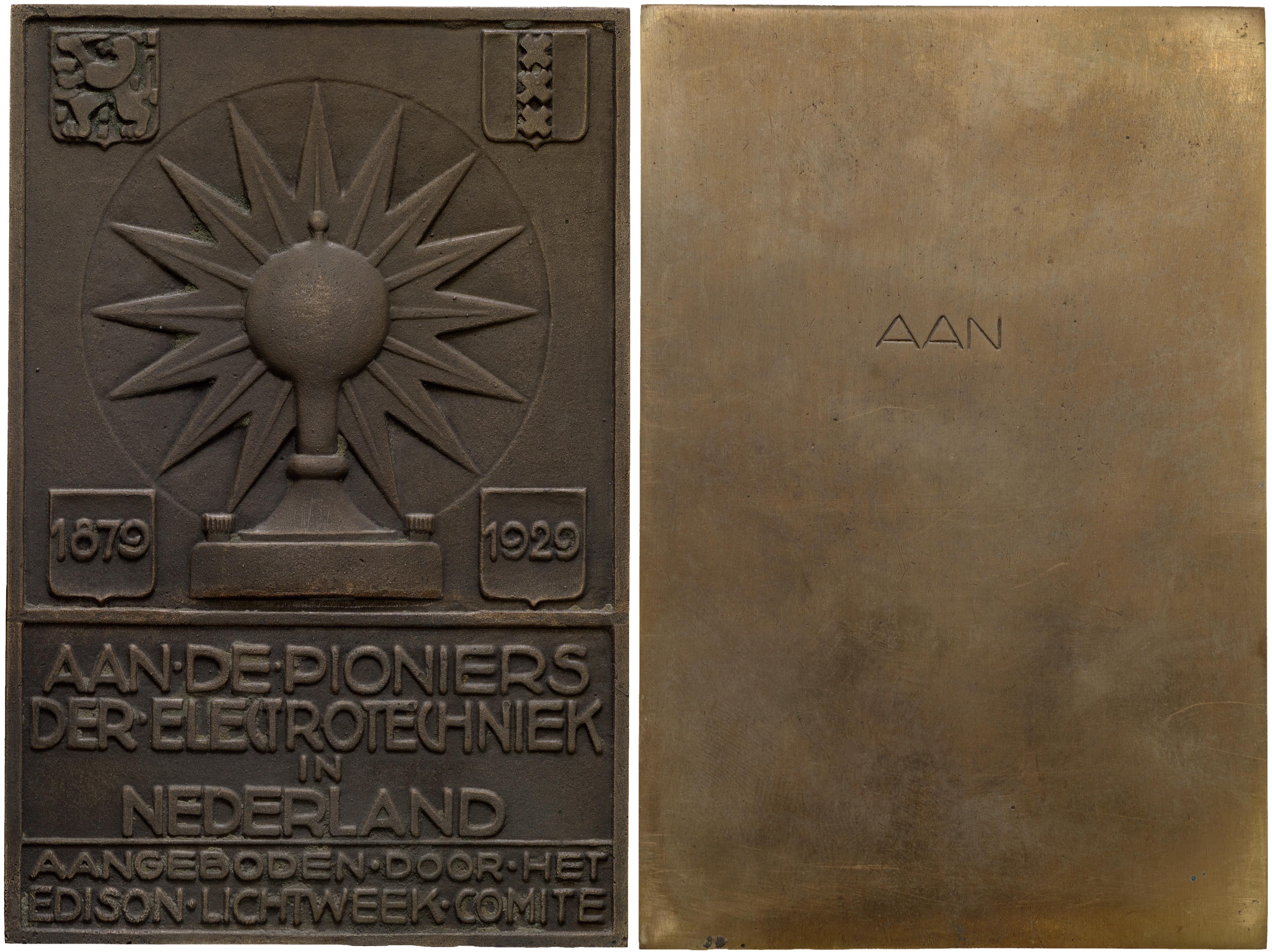Beeld voorzijde: gloeilamp omgeven door stralen in verdiept cirkelvormig veld, in de vier hoeken schildjes, boven met de wapens van Nederland en Amsterdam, onder met: 1879-1929