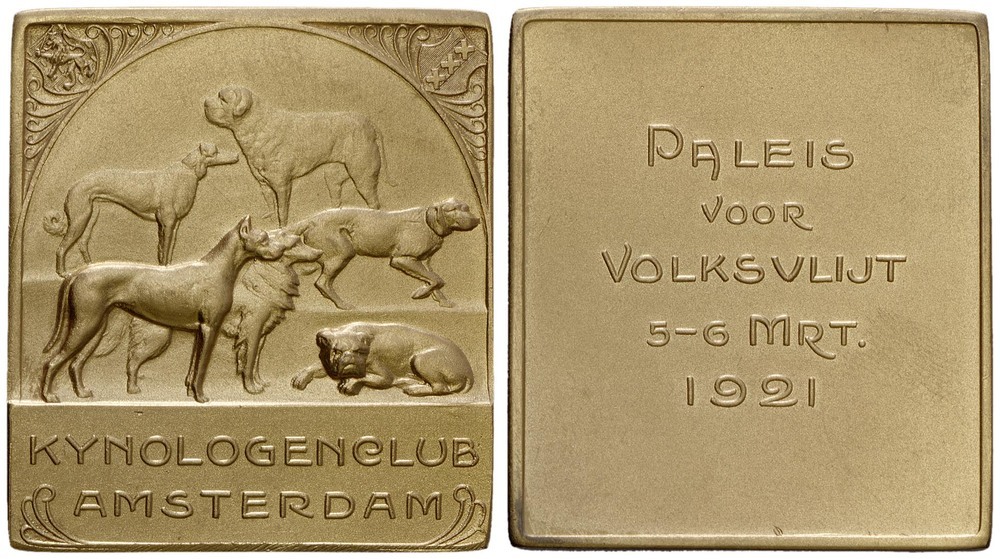 voorzijde: afbeelding van zes verschillende rashonden, vier staand naar rechts, één staand naar links en één liggend naar links. Links bovenin de hoek het wapen van Nederland en rechts boven in de hoek het wapen van Amsterdam. Onder de afbeelding een opschrift.