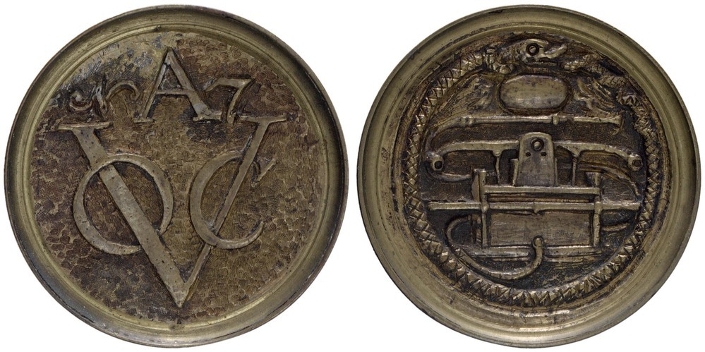 voorzijde: monogram van de VOC Amsterdam. keerzijde: brandspuit met draagbaar, omgeven door een Ouroboros, bovenin een leeg veld.- Trefwoorden