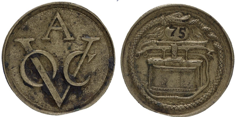 voorzijde: monogram van de VOC Amsterdam. keerzijde: brandspuit omgeven door een Ouroboros, bovenin een nummer.- Trefwoorden