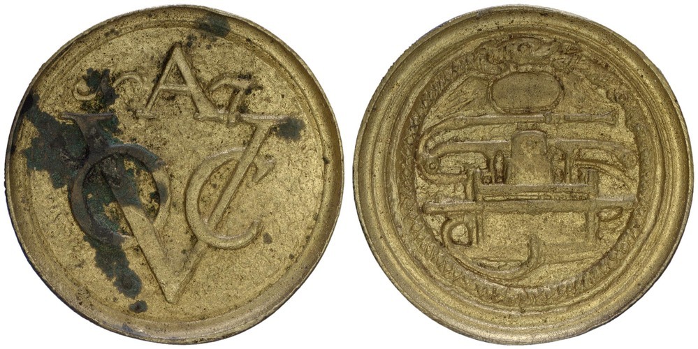 voorzijde: monogram van de VOC Amsterdam. keerzijde: brandspuit met draagbaar, omgeven door een Ouroboros, bovenin een leeg veld.- Trefwoorden