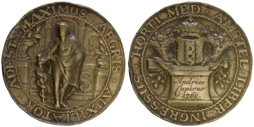 voorzijde: Aesculapius met zijn staf; achter hem een gebouw, links en rechts vazen met planten. Voorzien van een omschrift.