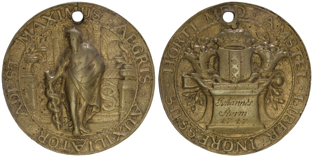 voorzijde: Aesculapius met zijn staf; achter hem een gebouw, links en rechts vazen met planten. Voorzien van een omschrift. Bovenin doorboord.