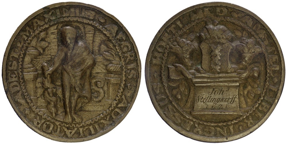 keerzijde: Het gekroonde wapen van Amsterdam tussen twee horens van overvloed op een voetstuk met inscriptie. Voorzien van een omschrift.