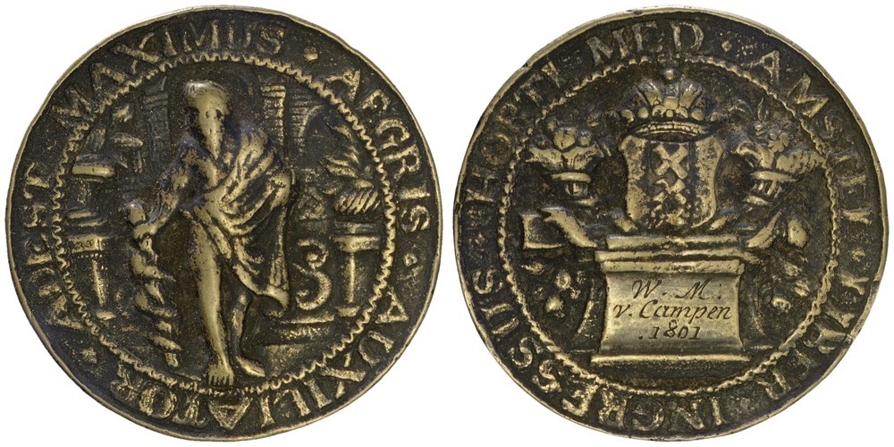 keerzijde: Het gekroonde wapen van Amsterdam tussen twee horens van overvloed op een voetstuk met inscriptie. Voorzien van een omschrift.