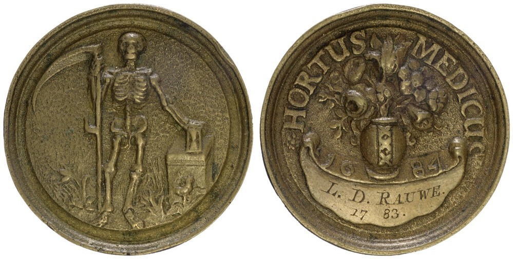 voorzijde: een geraamte, en face, in zijn rechterhand een zeis. Zijn linkerhand rust op een zandloper, geplaatst op een altaar.