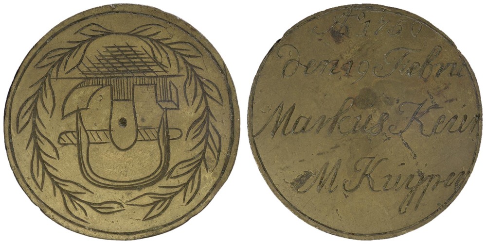 voorzijde: in een cirkelgroef kuipersgereedschap in een bladerkrans. keerzijde: in een cirkelgroef een naam en datum gegraveerd.- Trefwoorden