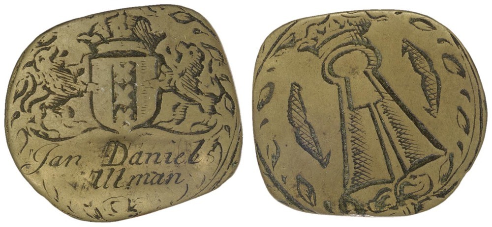 keerzijde: binnen een cirkelgroef, het gekroonde wapen van Amsterdam gehouden door twee leeuwen, daaronder een schild met naam. Omgeven door een bladerkrans.