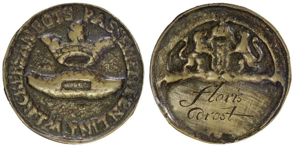 voorzijde: een gekroonde weversspoel, met omschrift. keerzijde: het gekroonde wapen van Amsterdam gehouden door twee leeuwen, daaronder op een schild een naam gegraveerd.