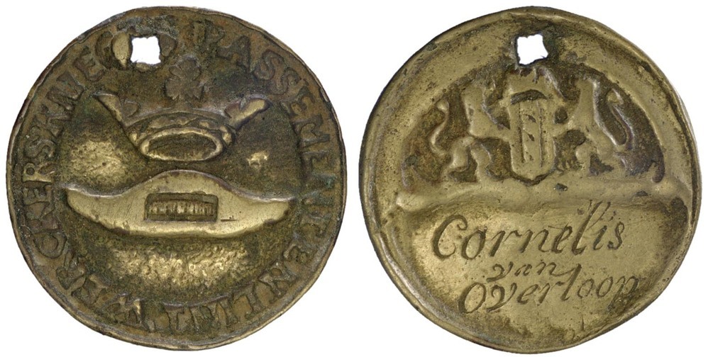 keerzijde: het gekroonde wapen van Amsterdam gehouden door twee leeuwen, daaronder op een schild een naam gegraveerd. Aan de bovenzijde doorboord.