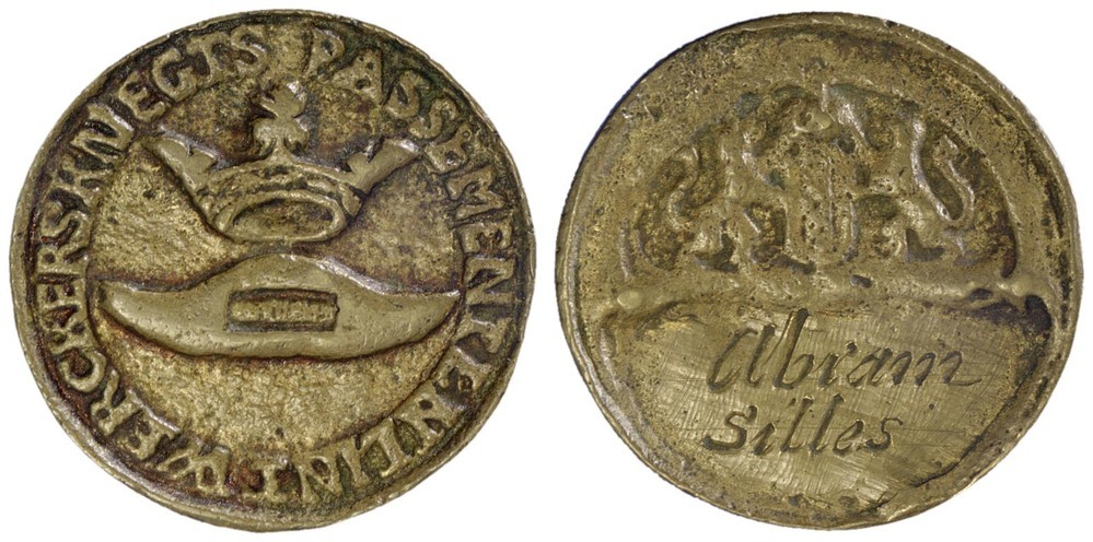 voorzijde: een gekroonde weversspoel, met omschrift. keerzijde: het gekroonde wapen van Amsterdam gehouden door twee leeuwen, daaronder op een schild een naam gegraveerd.
