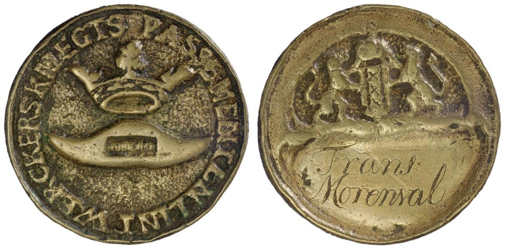 keerzijde: het gekroonde wapen van Amsterdam gehouden door twee leeuwen, daaronder op een schild een naam gegraveerd.