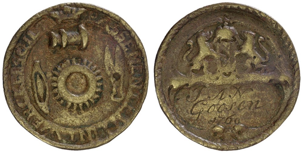 voorzijde: omschrift met kroontje. Weversgereedschap: klos, spoel, rad, schaar met punten naar boven. Kabelrand.