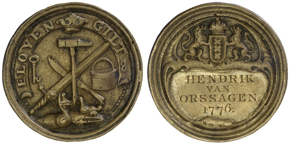 voorzijde: het gekroonde wapen van Amsterdam gehouden door twee leeuwen. Daaronder een cartouche met naam en jaartal.