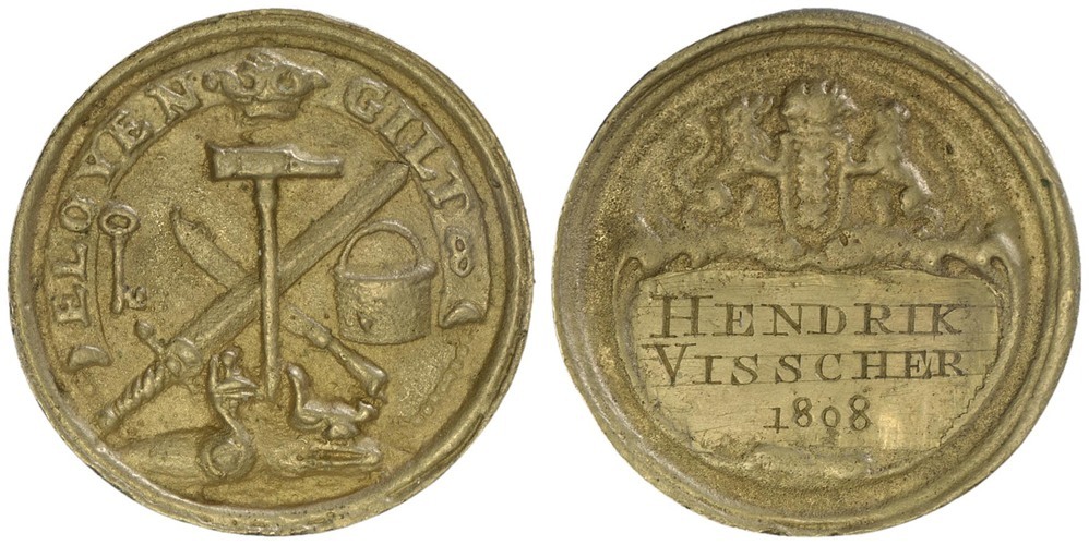 keerzijde: een omschrift waar bovenin een kroon. Onder de kroon een hamer, zwaard, mes, emmer, sleutel en geweerslot.