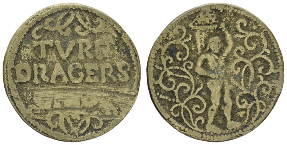 voorzijde: tekst tussen twee strikken: TURF - DRAGERS - GILDT. Langs de rand een parelcircel. keerzijde: een turfdrager tussen guirlanden, langs de rand een parelcircel.- Trefwoorden