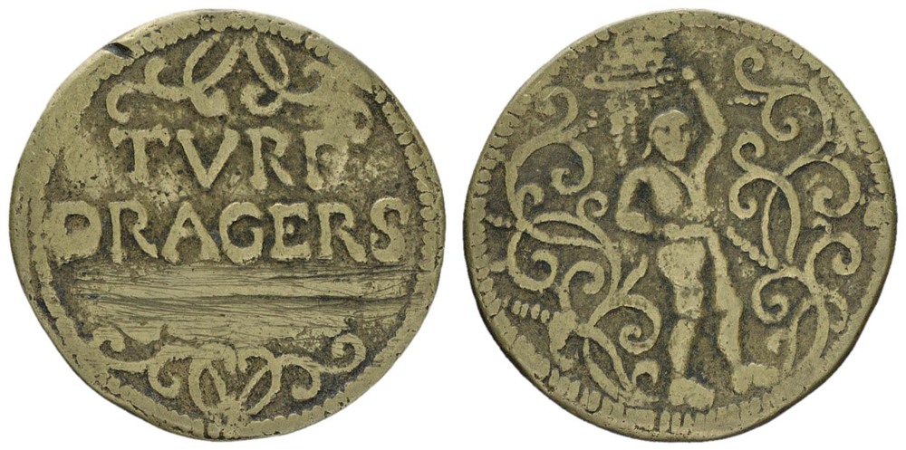 voorzijde: tekst: TURF - DRAGERS, tussen twee strikken, langs de rand een parelcircel. keerzijde, een turfdrager tussen guirlanden, langs de rand een parelcircel.- Trefwoorden