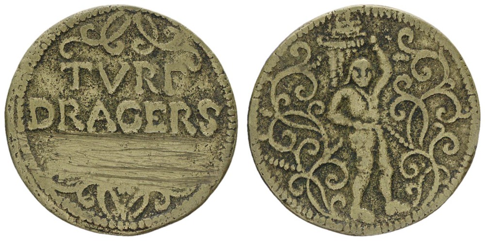voorzijde: tekst: TURF - DRAGERS, tussen twee strikken, langs de rand een parelcircel. keerzijde, een turfdrager tussen guirlanden, langs de rand een parelcircel.- Trefwoorden