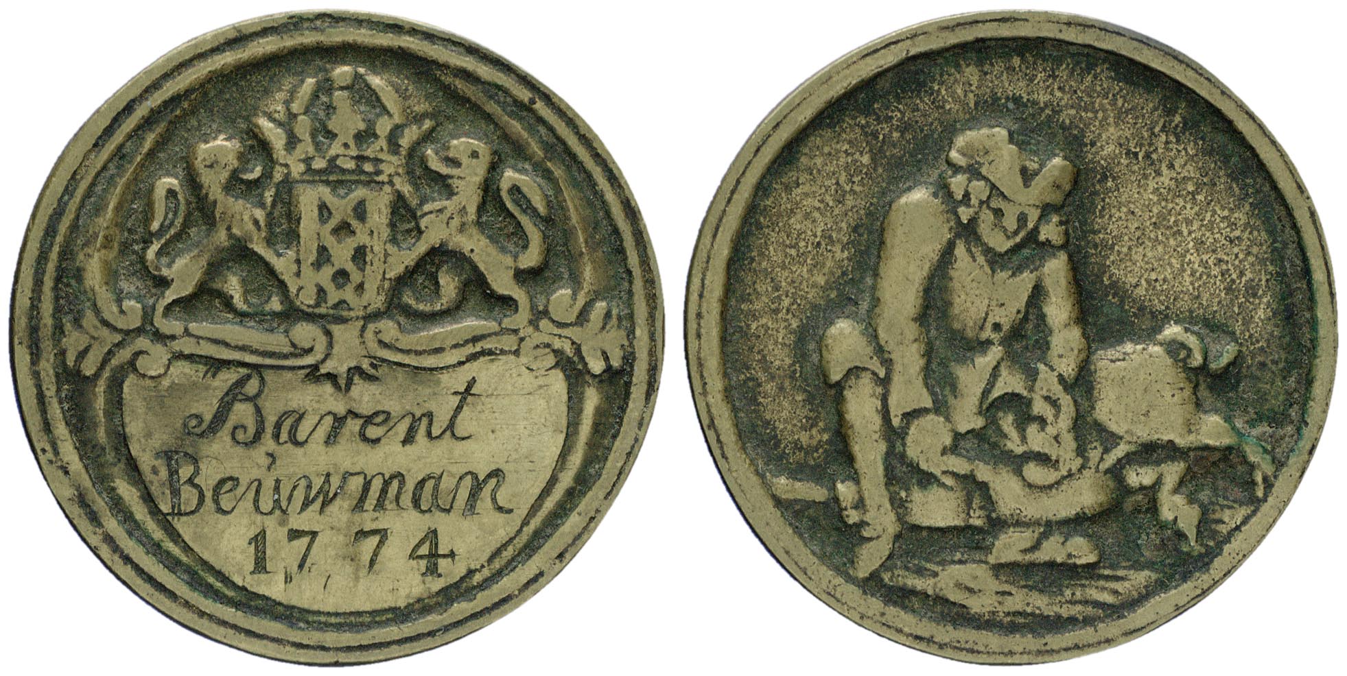 voorzijde: het gekroonde wapen van Amsterdam, gehouden door 2 leeuwen. Daaronder een schild, waarop een naam staat gegraveerd met jaart