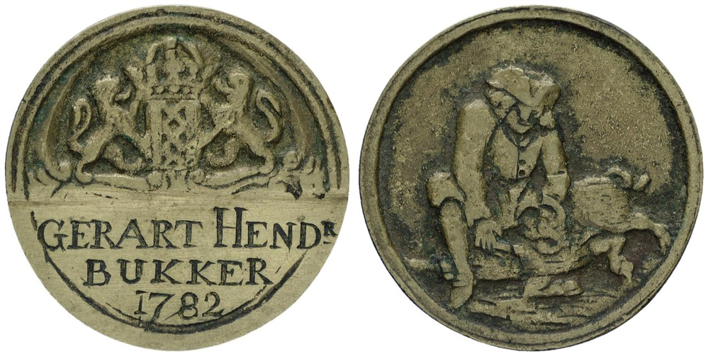 voorzijde: het gekroonde wapen van Amsterdam, gehouden door 2 leeuwen. Onder de afsnede staat een naam en jaartal gegraveerd.