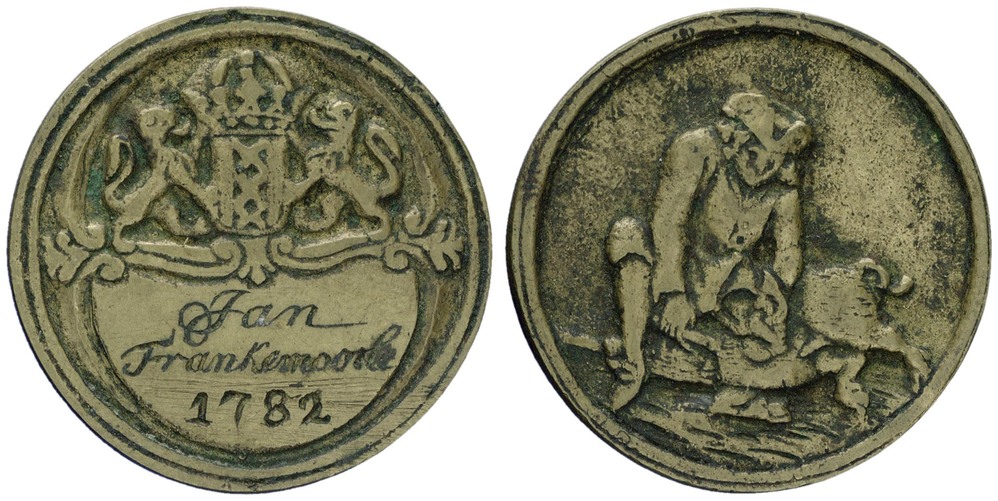 voorzijde: het gekroonde wapen van Amsterdam, gehouden door 2 leeuwen. Daaronder een schild, waarop een naam staat gegraveerd met jaartal 1782.