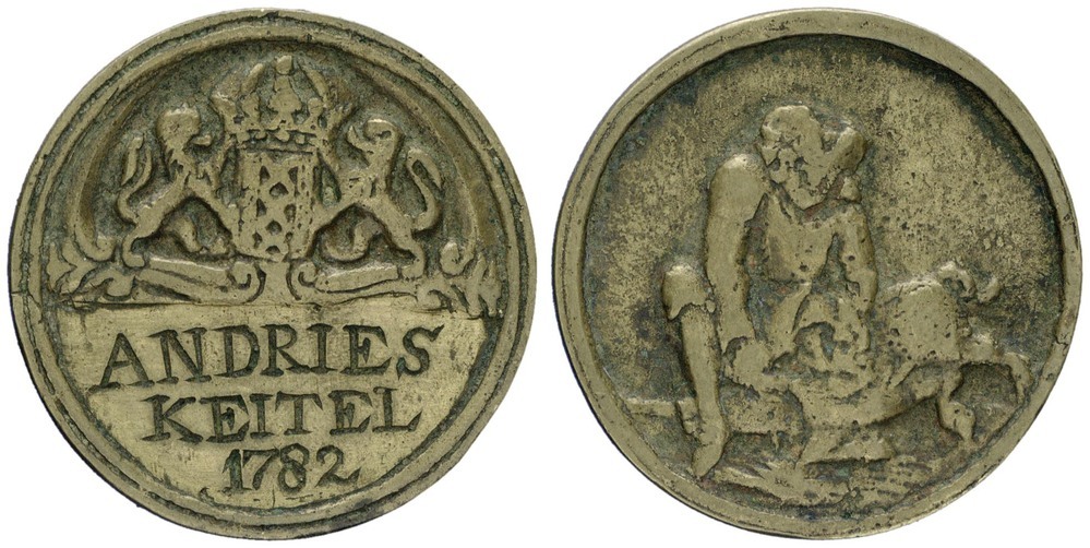 voorzijde: het gekroonde wapen van Amsterdam, gehouden door 2 leeuwen. Onder de afsnede staat een naam en jaartal gegraveerd.