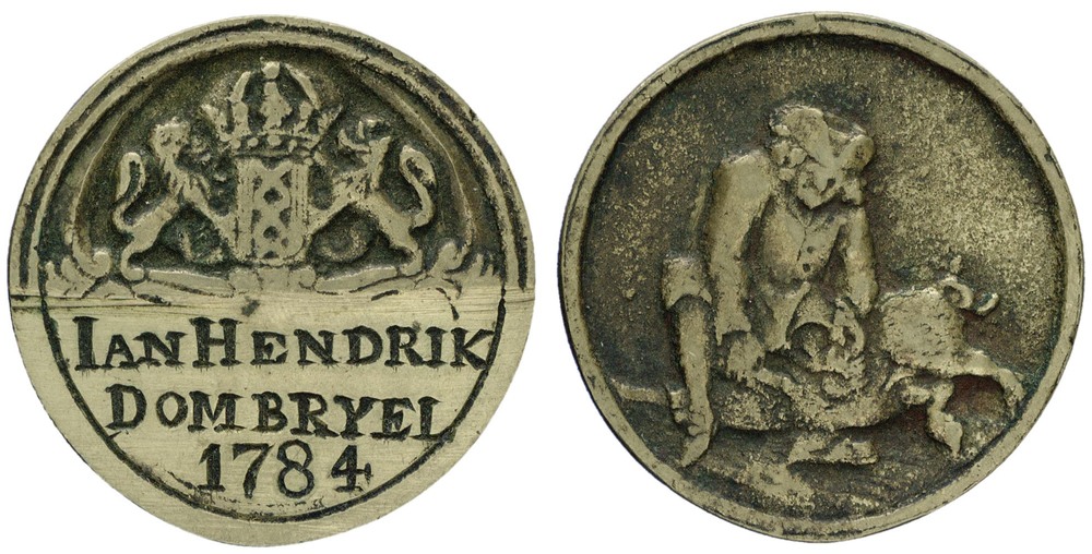 voorzijde: het gekroonde wapen van Amsterdam, gehouden door 2 leeuwen. Daaronder een schild, waarop een naam staat gegraveerd met jaartal.