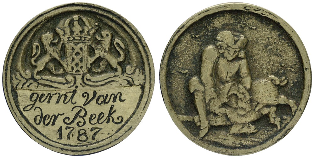 voorzijde: het gekroonde wapen van Amsterdam, gehouden door 2 leeuwen. Daaronder een schild, waarop een naam staat gegraveerd met jaartal.