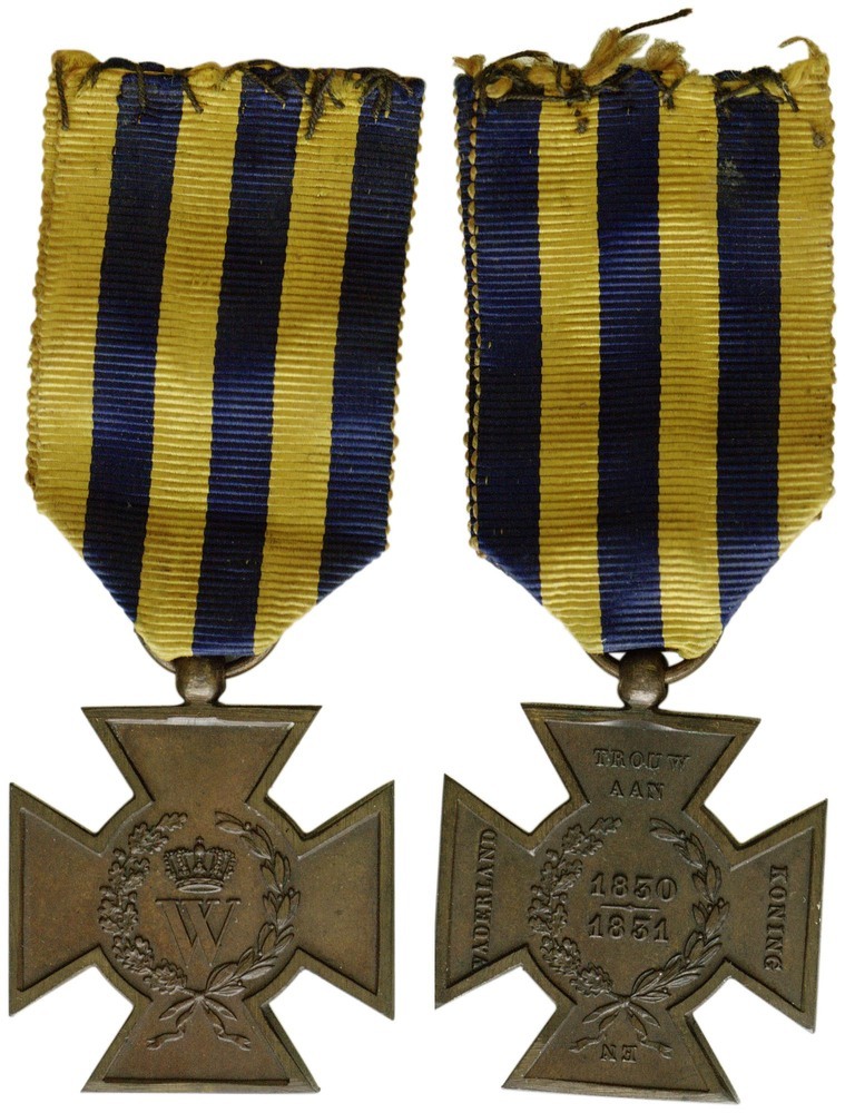 keerzijde: deze heeft dezelfde krans als aan de voorzijde, waarbinnen de jaartallen "1830-1831" gegraveerd zijn. Op de armen van het kruis is de tekst "TROUW AAN / KONING / EN / VADERLAND" te lezen. Het lint is verdeeld in zes gelijke banen nassaublauw en oranje, beginnend aan de linkerzijde met een blauwe baan.