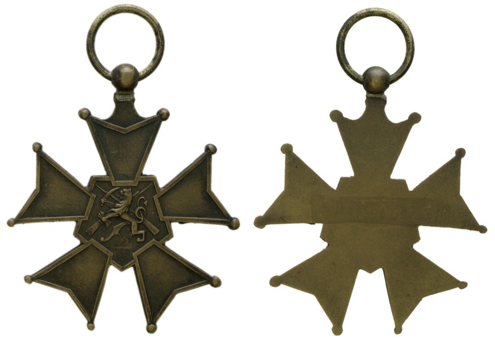 voorzijde: een 5-armig Malthezerkruis met geparelde punten; in het midden een 5-hoek met bastionvormige uitsteeksels. Daarbinnen de Nederlandse leeuw, waarachter twee gekruiste geweren. Aan de top een knop met gat waardoorheen een ring. keerzijde: onbewerkt.- Trefwoorden
