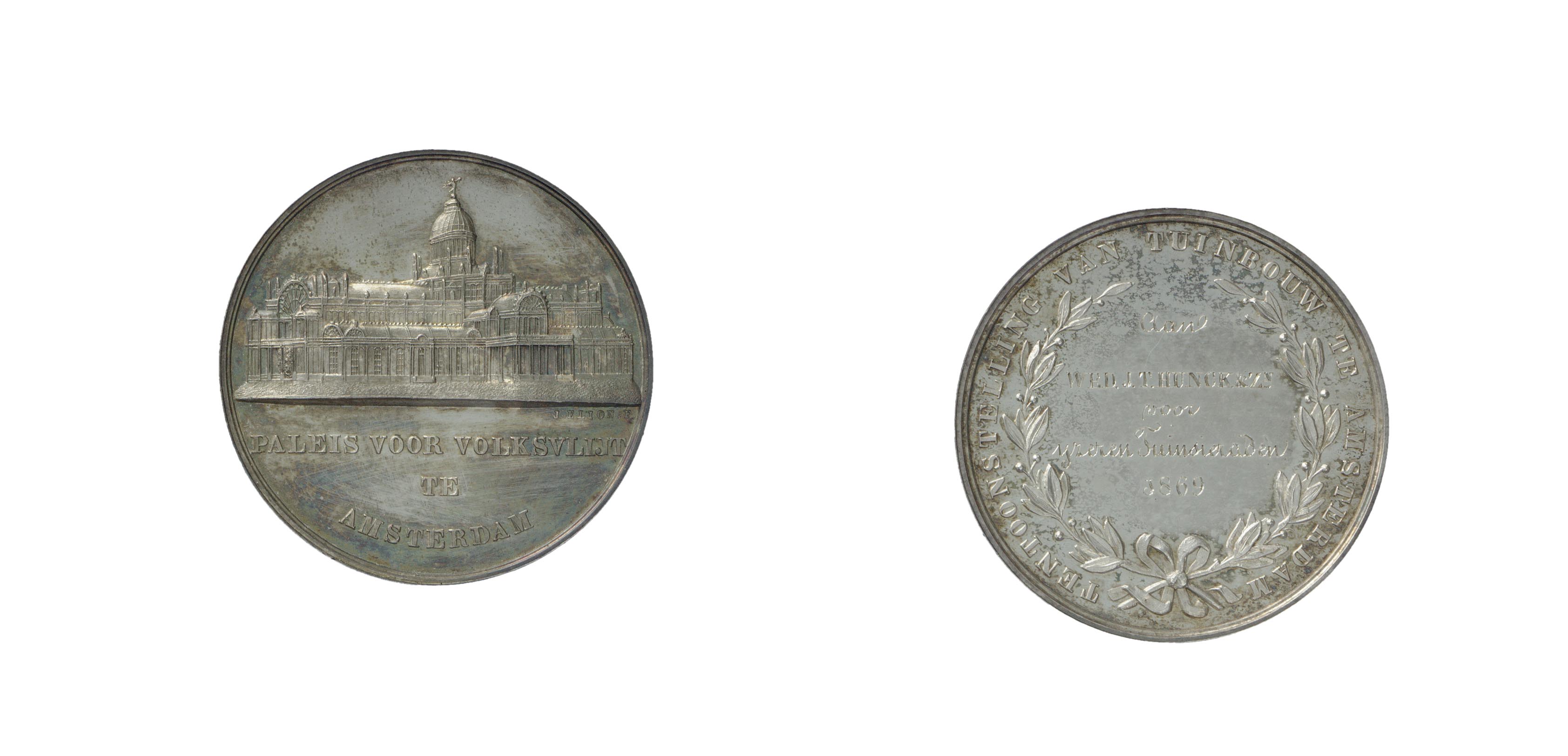 omschrift keerzijde: aan WED. J.T. HUNCK & ZN. / Voor / IJzeren Tuinsieraden / 1869