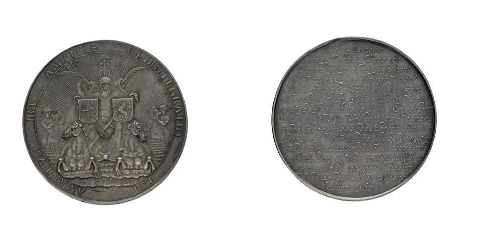 opschrift keerzijde: Ter Memorie / der Vrede, Unie en / Confederatie, den 15 April / solemnelyck gesloten tot / West-Munster, tusschen zijn / Hoogheyt den Heer Protecteur / vande Republique van Engelant, / Schotlant, en Irlant ter eener, / en de Hooghmogende Heeren Staten / Generaal ter andre sijde; daer op / wederzijts Ratificatie in behoorlijcke / forme den 2 der maent May is / uytgewisselt en gepubliceert / den 27 der selver Maent / Anno 1654.
