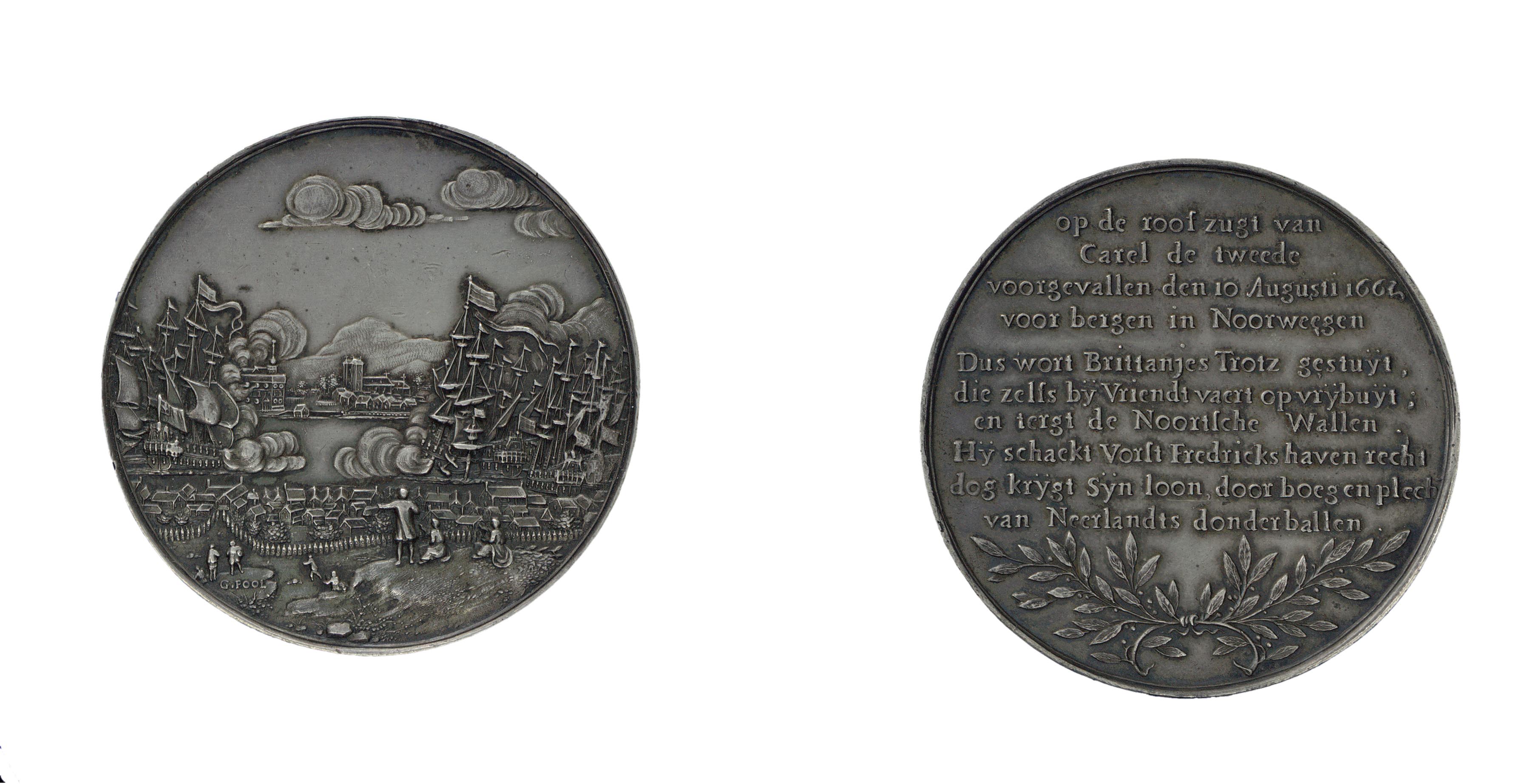 opschrift keerzijde: op de roofzugt van / Carel de tweede / voorgevallen den 10 Augusti 1664 / voor bergen in Noorwegen / Dus wort Brittanjes Tritz gestuyt, / die zelfs by Vriendt vaert op vrybuyt; / en tergt de Noortsche Wallen. / Hy schackt Vorst Fredericks haven recht / dog krygt Syn loon door boeg en plech / van Neerlandts donderballen.