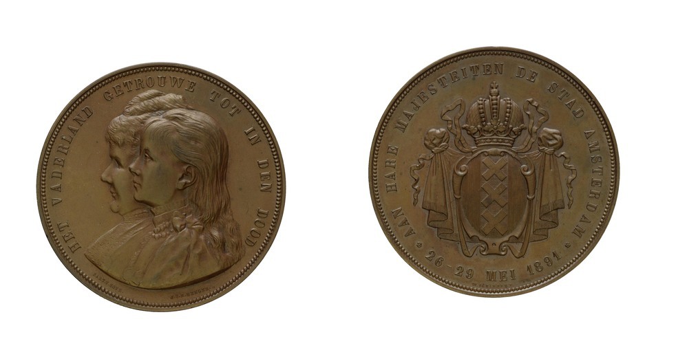 omschrift keerzijde: AAN HARE MAJESTEITEN / DE STAD AMSTERDAM * 26-29 MEI 1891 *