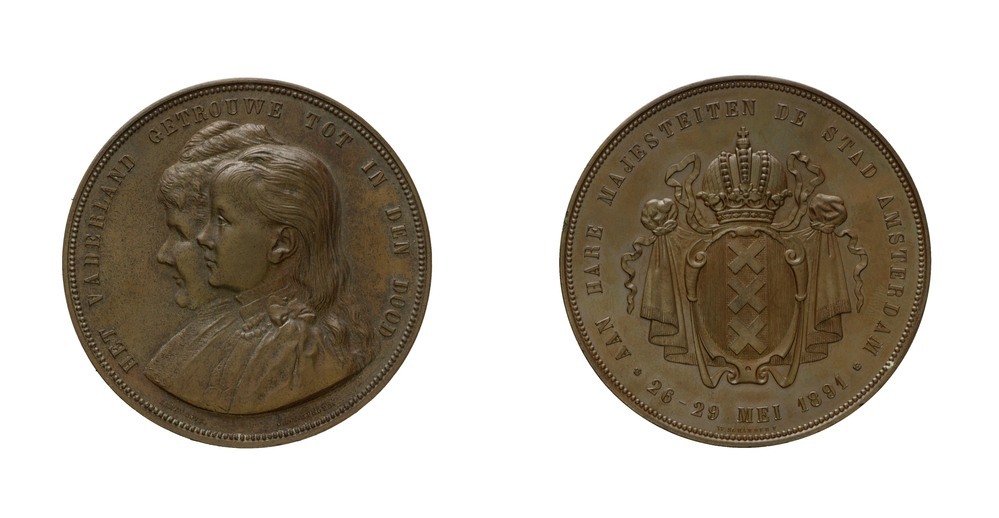 omschrift keerzijde: AAN HARE MAJESTEITEN / DE STAD AMSTERDAM * 26-29 MEI 1891 *